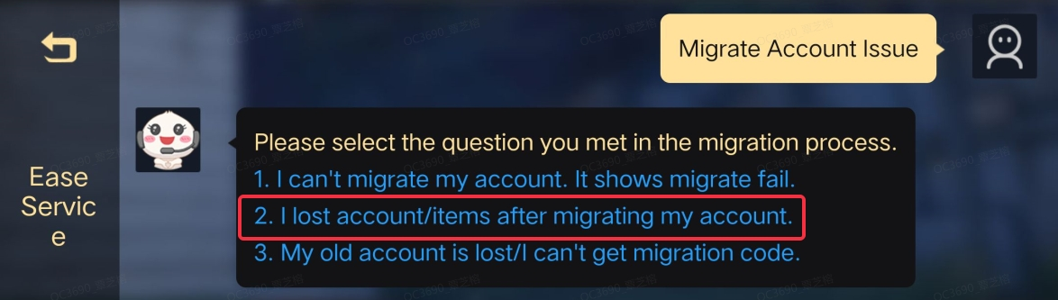 2. Tap 【Help and Support】-> 【Migrate Account Issue】-> 【I lost account/items after migrating my account.】