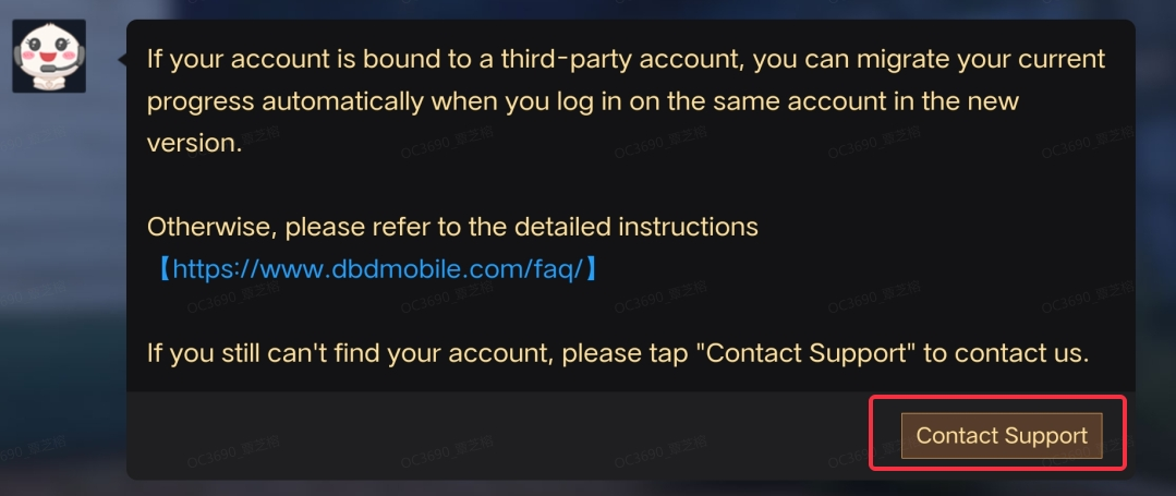 R: Puedes ponerte en contacto al correo dbdmobile-en@global.netease.com o solicitar ayuda en nuestro canal de Discord. Nuestro equipo de atención al cliente se pondrá en contacto contigo en un periodo de 1 a 3 días.